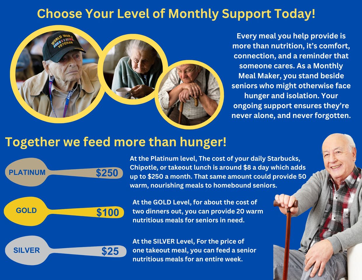 Your monthly gift ensures warm, nutritious meals are delivered with care—every day, every week, every month. With your ongoing support, no senior has to face hunger or loneliness alone.